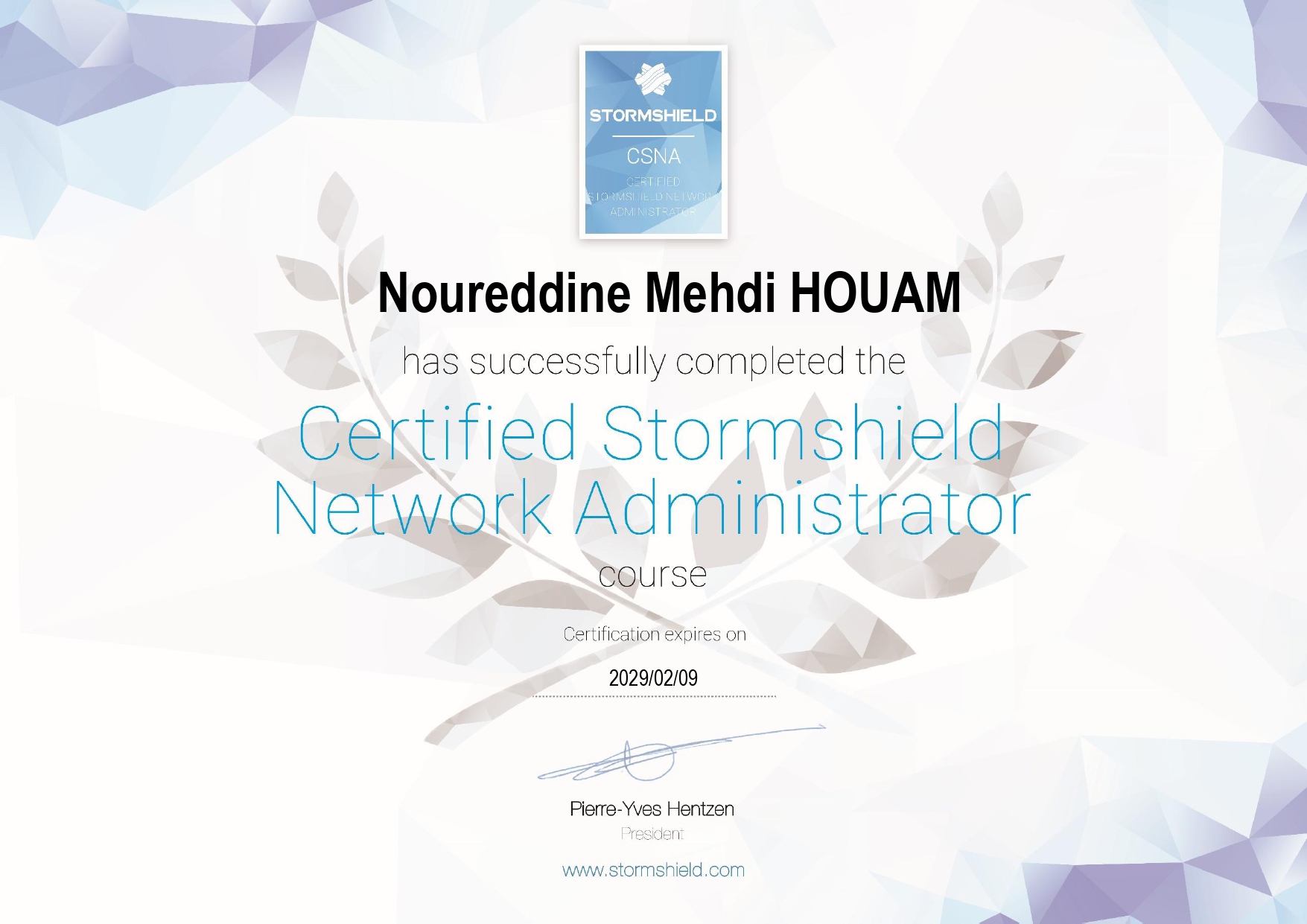 Certification officielle Stormshield validant la maîtrise des firewalls Stormshield : filtrage, NAT, VPN IPsec/SSL, authentification, objets, supervision et configuration réseau sécurisée.